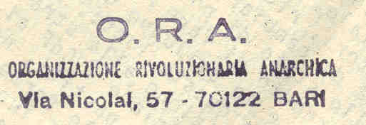 ORA 'Organizzazione Rivoluzionaria Anarchica, già Organizzazione Anarchica Pugliese, è un movimento politico anarchico italiano nato in Puglia. Nel 1976, l’OAP muta il suo nome in Organizzazione Rivoluzionaria Anarchica (ORA), sulla base delle esperienze coeve in Francia ed Inghilterra. Lo stesso anno si tiene a Bari il 1° Congresso regionale dell'Organizzazione Rivoluzionaria Anarchica (ORA), che riprende il nome e l'ispirazione politica dell'ORA di Francia e costituisce sezioni nelle città più importanti della Puglia, qualificandosi per l'intervento nei quartieri, nelle scuole e nelle università, e per l'impegno antifascista. L'ORA pugliese si pone come progetto di organizzazione politica dei comunisti anarchici italiani e si dà tesi politiche originali ispirate dalla Piattaforma dei Comunisti Anarchici del 1926 e dalle istanze di base espresse dai movimenti sociali dal 1968 in poi. Nel 1978, si tiene a Bari il 1° Congresso Nazionale dell'Organizzazione Rivoluzionaria Anarchica a cui aderiscono anche militanti comunisti anarchici dell'Emilia, della Lombardia, della Campania, ed in seguito nelle Marche, nel Veneto, in Piemonte.