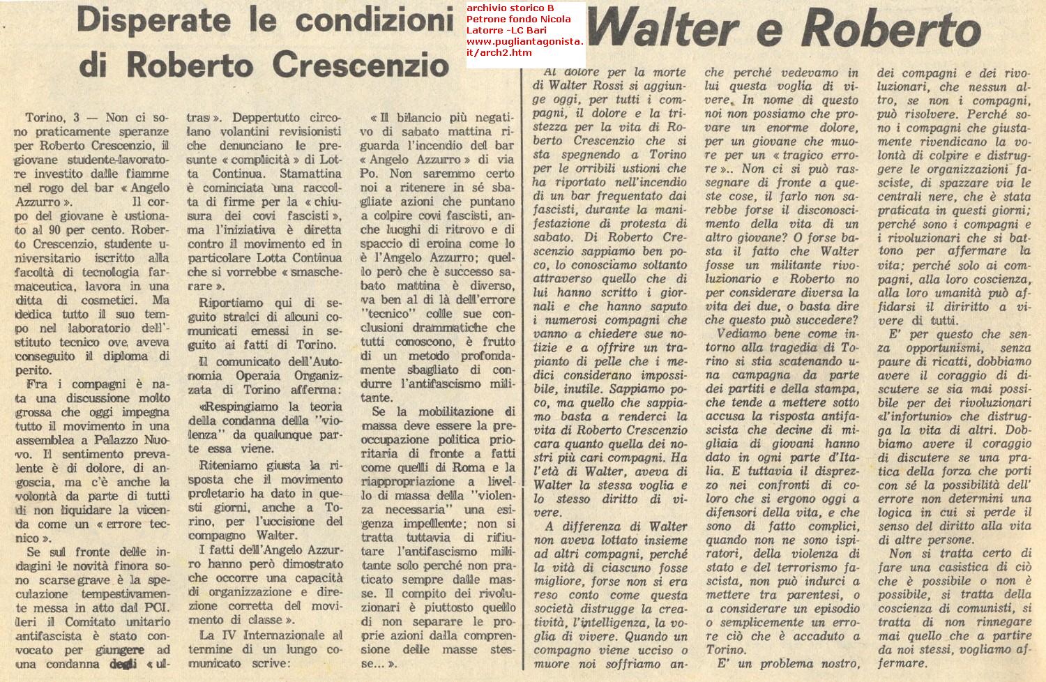 UCCISO DAI FASCISTI SOTTO GLI OCCHI DELLA POLIZIA: NESSUN COLPEVOLE Roberto Crescenzio vittima incolpevole della rabbia ,col sangue agli occhi, che prese in quei giorni la nostra generazione.Due dolori che portiamo nei nostri cuori ma una sola certezza: i colpevoli sono i fascisti e i loro protettori che permisero per troppo tempo impunità assoluta e ci fecero perdere la speranza nella giustizia Tutto iniziò alcuni giorni prima con tre tentati omicidi da parte dei fascisti romani che scorazzano impuniti . Per protestare contro l'ultimo ferimento di una compagna Elena Paccinelli , Walter rossi insieme ad altri compagni il 30 settembre 77 sta volantinando quando i fascisti usciti dalla sede del MSI della Balduina e accompagnati da un blindato della polizia , sparano ammazzando Walter e rimangono per qualche tempo fermi a congratularsi del colpo. poi si ritirano nella sede. La polizia invece di arrestarli , si avventa sui compagni e ne ferma uno manganellandolo sul cellulare e addirittura ostacola lo stesso trasporto di Walter all'ospedale e poi, dopo aver dato tempo ai fascisti di far sparire armi, prove e colpevoli, la polizia si presenta nella sede del MSI a pochi metri dall'accaduto. Questo e altre terribili ed incredibili storie le riproponiamo oggi, ricordando Walter e tanti altri compagni uccisi che non hanno avuto giustizia , come Benedetto Petrone. per non dimenticare. Tragedia infinita ; Roberto Crescenzio, studente lavoratore , a Torino il giorno dopo muore bruciato vivo durante un assalto di uno spezzone di corteo contro un bar frequentato solitamente dai fascisti. Lo sgomento prese tutti, gettando nella disperazione anche i più duri tra i servizi d'ordine...d'ora in poi i cortei dei compagni sarebbero stati visti di cattivo d'occhio da troppi e ciò avrebbe dato adito ad altre misure repressive. IL FERIMENTO DI ELENA PACCINELLI E IL CLIMA DI PAURA DI QUEI GIORNI
