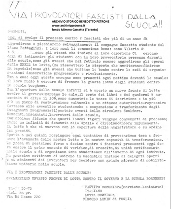 NOTA: Questo fondo archivistico la cui catalogazione ci è stato affidato dal compagno Mimmo Cassetta di Taranto è attualmente in fase di lavorazione. Chiediamo scusa e invitiamo a leggere l'approfondimento riguardante l'aggressione fascista subita dal giovanissimo Mimmo quando era studente al Liceo Battaglini di Taranto, il 22 settembre 1970