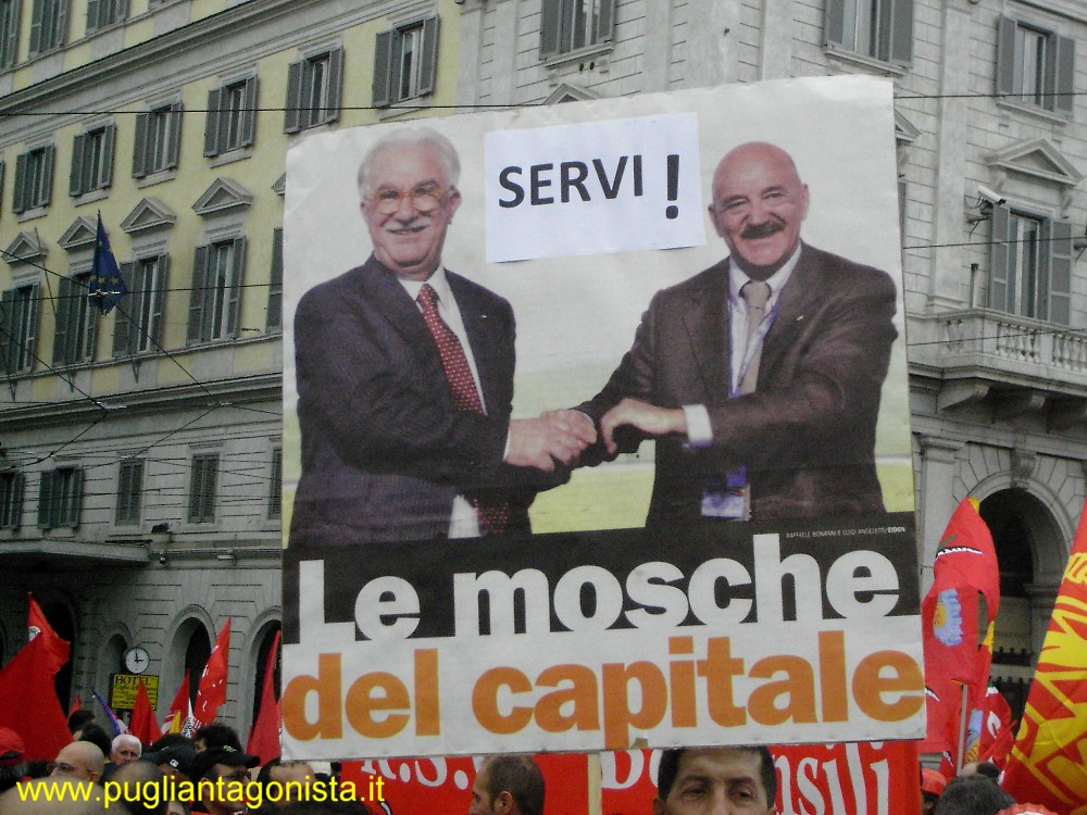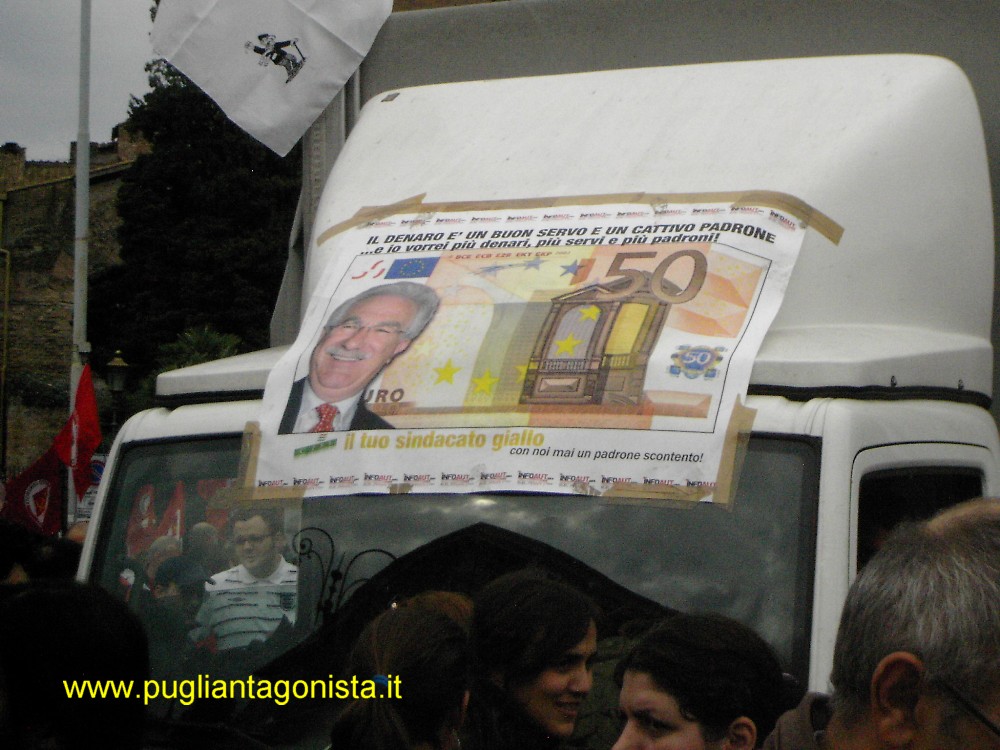 COMUNICATO DELLA CGIL CHE VOGLIAMO PUGLIA AGOSTO 2011 16 OTTOBRE 2010 ROMA IL TAMBURO BLACKBLOK ROMA 16 OTTOBRE 2010 MANIFESTAZIONE INDETTA DALLA FIOM PER IL LAVORO CONTRO I RICATTI Una grande manifestazione che come Pugliantagonista la illustriamo con le nostre foto commentate LA PRESENZA HA RAPPRESENTATO LE REALTà DEL LAVORO E DEI NON GARANTITI DI TUTTA ITALIA IL SUD ERA PRESENTE IN MASSA PRESENTI I PENSIONATI ma la presenza dei giovani, studenti, disoccupati è stata enorme e determinate per dare il senso di questa manifestazione. PRESENTI LE DIVERSE COMPONENTI DELLA CGIL GLI OPERAI DELLA AIFO IVECO DI MILANO CON LE LORO LETTERINE INDIRIZZATE AL LEADER SINDACALE PIU' CITATO NELLA MANIFESTAZIONE BONANNI A LUI IN QUESTO CARTELLONE GLI OPERAI VORREBBERO ADDIRITTURA REGALARE 50 EURO DI LIQUIDAZIONE UN AMORE COSI' DICHIARATO CHE IN ALTRI CARTELLI LO AFFIANCAVANO ALL'ALTRO PIU' AMATO DAGLI OPERAI ANGELETTI